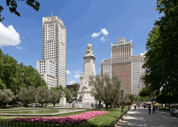 Plaza de Espana is a large square, a popular tourist destination located in central Madrid, Spain at the western end of the Gran Vía. It features a monument to Miguel de Cervantes Saavedra and is adjacent to two of Madrid's most prominent skyscrapers.