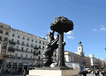 The Puerta del Sol is a public square in Madrid, one of the best known and busiest places in the city. This is the centre of the radial network of Spanish roads. The square also contains the famous clock whose bells mark the traditional eating of the Twelve Grapes and the beginning of a new year.