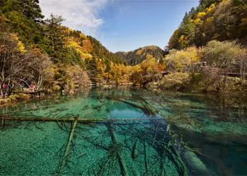 The national park has been described as a fairyland because of its many waterfalls,snow-covered karst mountains, and turquoise and green colored lakes.