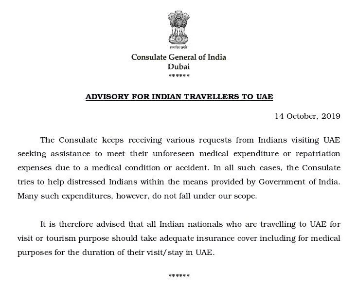 Indian travelers to Dubai should be aware that the Indian consulate in Dubai has issued a travel advisory for all Indians to buy good travel insurance from India while visiting Dubai. This is very important because even though the Indian consulate in Dubai, tries to help distressed Indians from unexpected medical expenditures and repatriation in case of sudden sickness or accidental injuries, it is not possible for the Government of India to cover all medical expenses.
