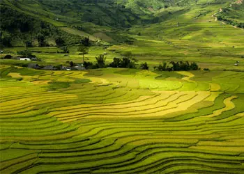 The verdant rice field countryside surrounding Sapa, bordered by the jagged peaks of the Hoang Lien Mountains.