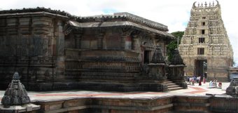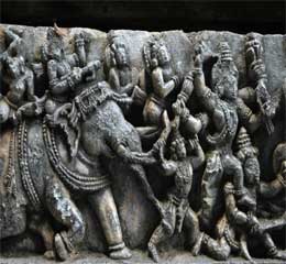 The founder of this dynasty, prince "Sala" fought with a tiger single handed. Legend has it that the prince's teacher shouted out "Hoy Sala" meaning "strike Sala", this later became the emblem of Hoysala dynasty. The first capital of the Hoysala dynasty was Halebidu. It was later shifted to Belur. You can reach Belur by road on the Bangalore Mangalore highway. Belur is about 250 Kms from Bangalore (around 40 kms from Hassan). Halebidu is around 16 kms. from Belur.