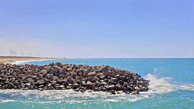 • Picturesque beach area known for its water sports, sunset views & solar-powered wind turbines
