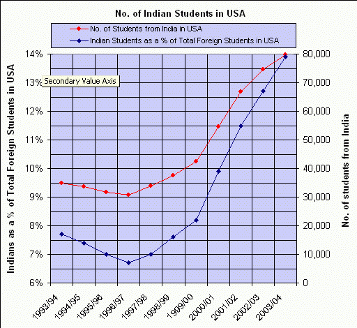 According to Open Doors 2004, the annual report on international academic mobility published by the Institute of International Education (IIE), the number of international students enrolled in U.S. higher education institutions decreased by 2.4% in 2003/04 to a total of 572,509, from 586,323 in 2002-03. The following data has been obtained from the India Country Fact Sheet in the Open Doors 2004 report.
