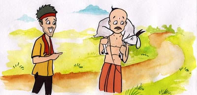 The first person approached the Brahmin and said, "Are you a washerman that you're pulling a donkey." The Brahmin was annoyed at being mistaken for a washerman. He went on. A little later he was met by the second of the three. The second person asked him why being a Brahmin he needed to pull a pig. Now the Brahmin was confused but he went on. Some distance later he was met by the third person who asked him why he was pulling along a wild animal. Now the Brahmin was totally confused and also afraid. He thought that it was a devil animal which took different forms. He ran away leaving the cow behind. The three tricksters laughed at the Brahmin at having obtained the cow from the Brahmin.
