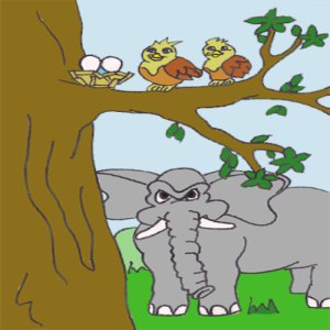 Once upon a time there lived a sparrow with her husband on a tree. She had built a nice nest and laid her eggs in the nest. One morning, a wild elephant with spring fever feeling restive came to the tree in search of shade and in a rage broke the branch of the tree on which the nest was residing. Unluckily all the sparrow eggs were lost though both parents were saved. The she-sparrow was deep in lament.