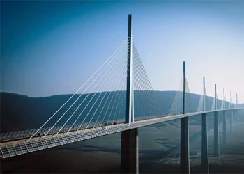 The Millau Bridge or Viaduct is a cable bridge that happens to be the tallest bridge in the world at 343 meters . The four-lane bridge spans the valley of the River Tarn in southern France.